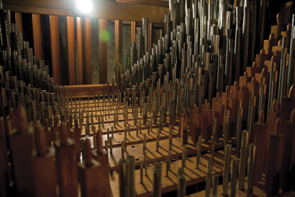 The organ’s 12,617 pipes range from 32 feet tall to the size of a pencil. These small pipes (above) are part of the Echo division, housed in the basement at the rear of Woolsey Hall.