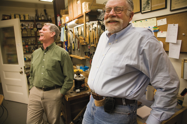 For 40 years, the organ’s musical and historical integrity has been guarded by Joe Dzeda (above, at left) and co-curator Nicholas Thompson-Allen (above, at right), shown in their basement workshop.